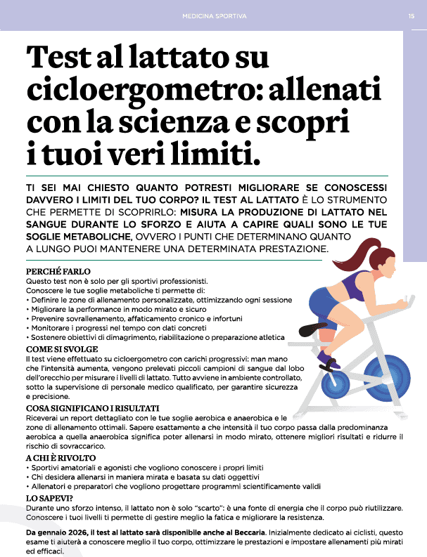 Il giorno 14/02 si terrà un open day dedicato: in questa occasione il TEST DEL LATTATO sarà gratuito e i pazienti pagheranno esclusivamente la visita medico-sportiva con test sotto sforzo alle seguenti tariffe agevolate: